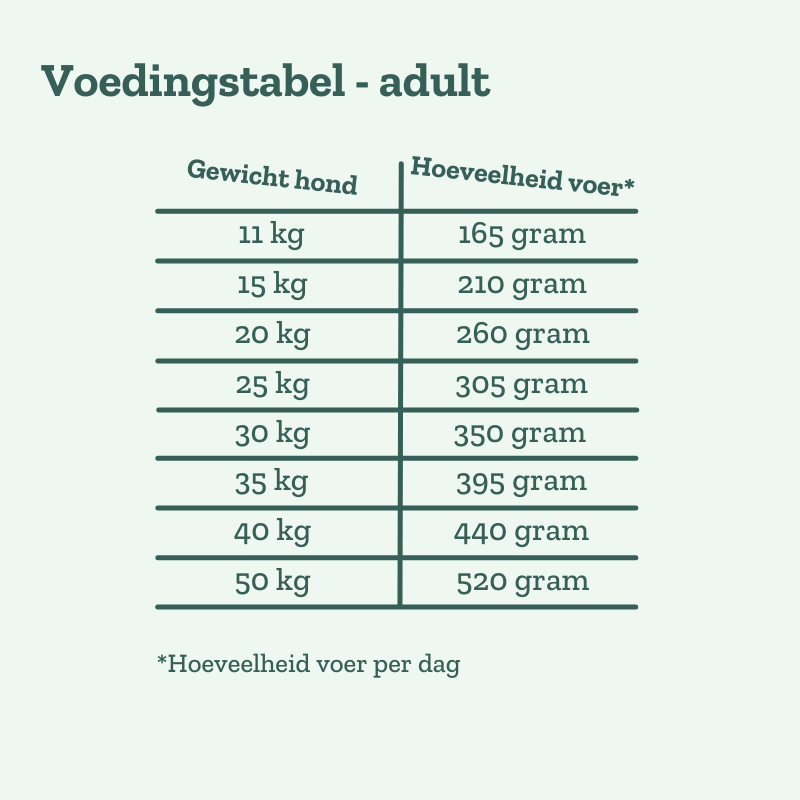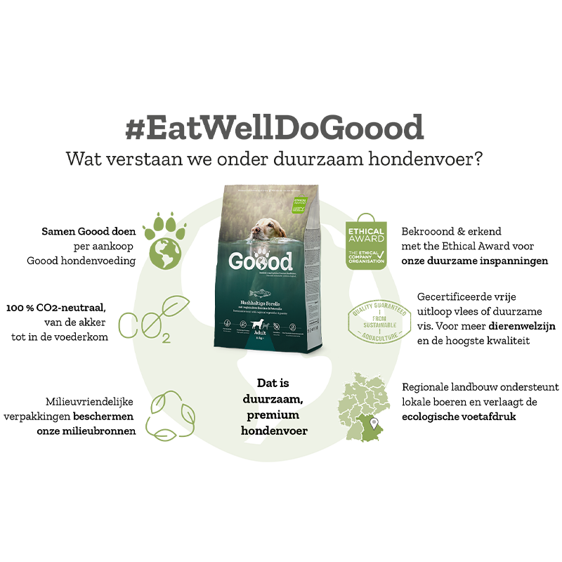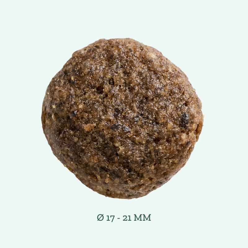 De forellen in deze hondenvoeding komen uit een duurzame aquacultuur en krijgen uitsluitend natuurlijk voer. Zo leveren ze de hoogwaardigste proteïnen aan dit hondenvoer. Onze groenten kopen we bij landbouwers uit de streek en die gaan rechtreeks in onze hondenbrokken. De graanvrije receptuur van dit droogvoer met vis, zonnebloemolie en lijnzaad bevat veel Omega 3- en -6-vetzuren en versterkt zo de huid en de vacht van volwassen honden.