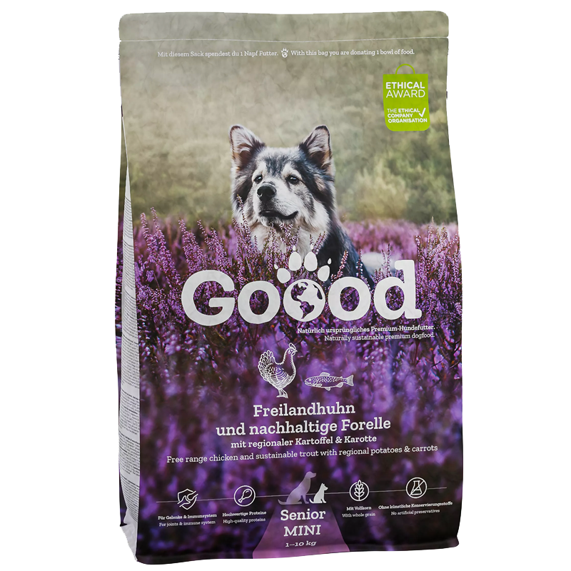 Dierenwelzijn is belangrijk voor ons, ook in de voorbereiding van onze hondenvoeding. Daarom krijgen onze kippen veel beweging en kunnen ze hun favoriete bezigheid – krabben en pikken – op een natuurlijke manier uitoefenen. Het welzijn en de gezondheid van vissen zijn ook erg belangrijk voor ons. Daarom letten we bij de selectie van onze kwekers op optimale houd omstandigheden voor forel. De aardappelen, wortelen en pastinaak in dit hondenvoer zijn afkomstig uit de regionale landbouw. Alle componenten van dit droogvoer worden zorgvuldig verwerkt en zijn ook verteerbaar voor gevoelige senioren met intoleranties. Ons goed verteerbare recept voor deze hondenbrokken heeft geen toegevoegde suikers of kunstmatige kleur-, smaak- of conserveringsmiddelen nodig. Groenlipmossel en vitamines zijn goed voor de gewrichten en het immuunsysteem, zodat je lieveling alle voedingsstoffen krijgt die hij of zij nodig heeft voor een vitaal leven, zelfs op hoge leeftijd.