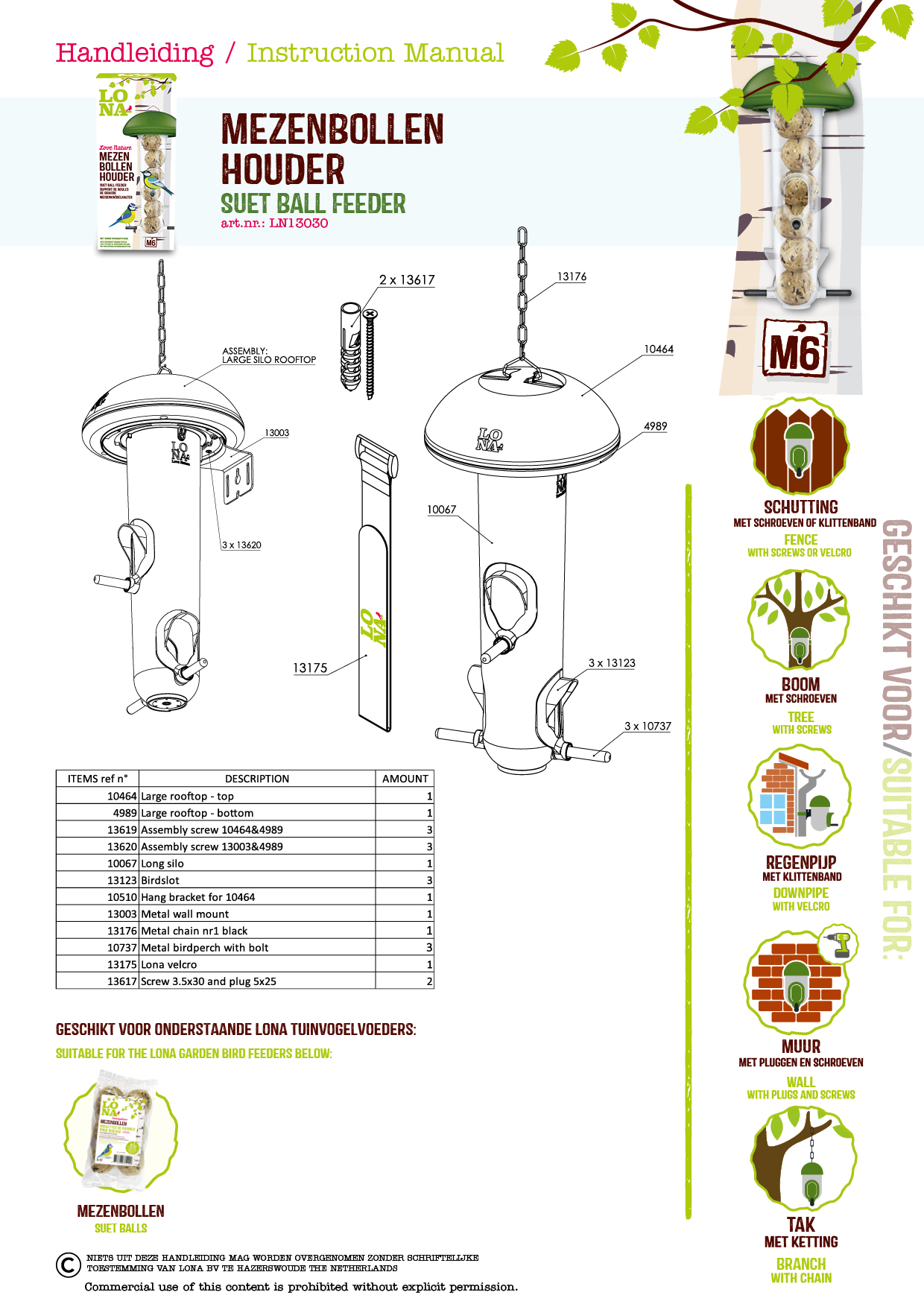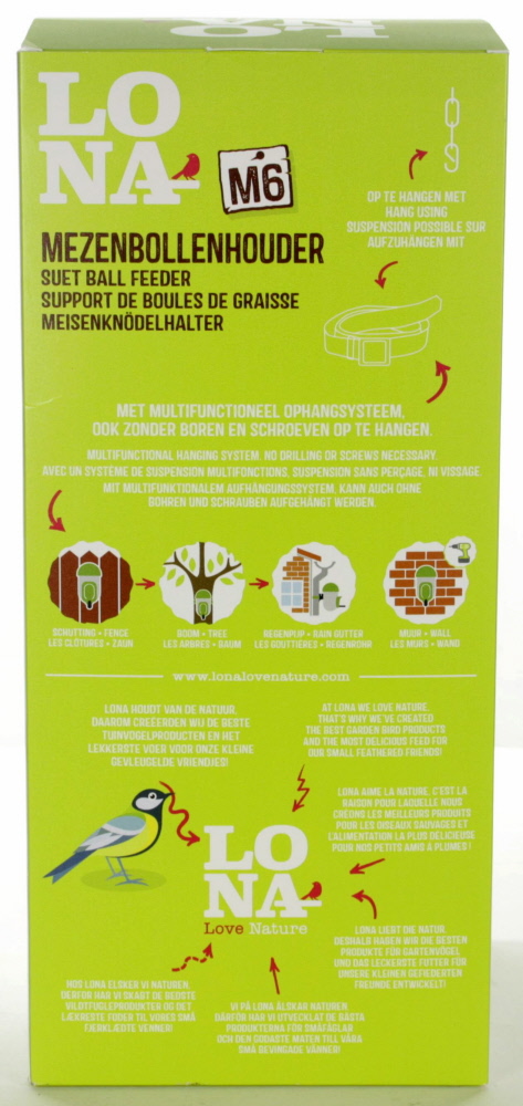 LONA M6 is een duurzame mezenbollenhouder met 3 voerunits en is extra hoog om maar liefst 6 mezenbollen tegelijk te plaatsen. Voor kleine tuinvogels zoals mezen, vinken, mussen en soortgenoten. Eenvoudig te bevestigen aan een regenpijp, boomstam, schutting, tak, muur of pergola.