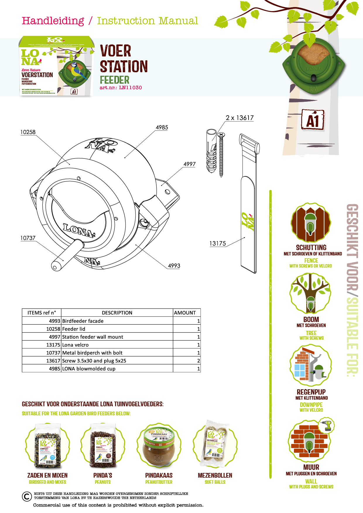 LONA A1 is een voerstation met heel veel mogelijkheden voor het voeren van kleine tuinvogels. Geschikt voor alle LONA-tuinvogelvoeders, LONA-pindakaas én zelfs mezenbollen: het kan allemaal. Eenvoudig te bevestigen aan een regenpijp, boomstam, schutting, muur of pergola.