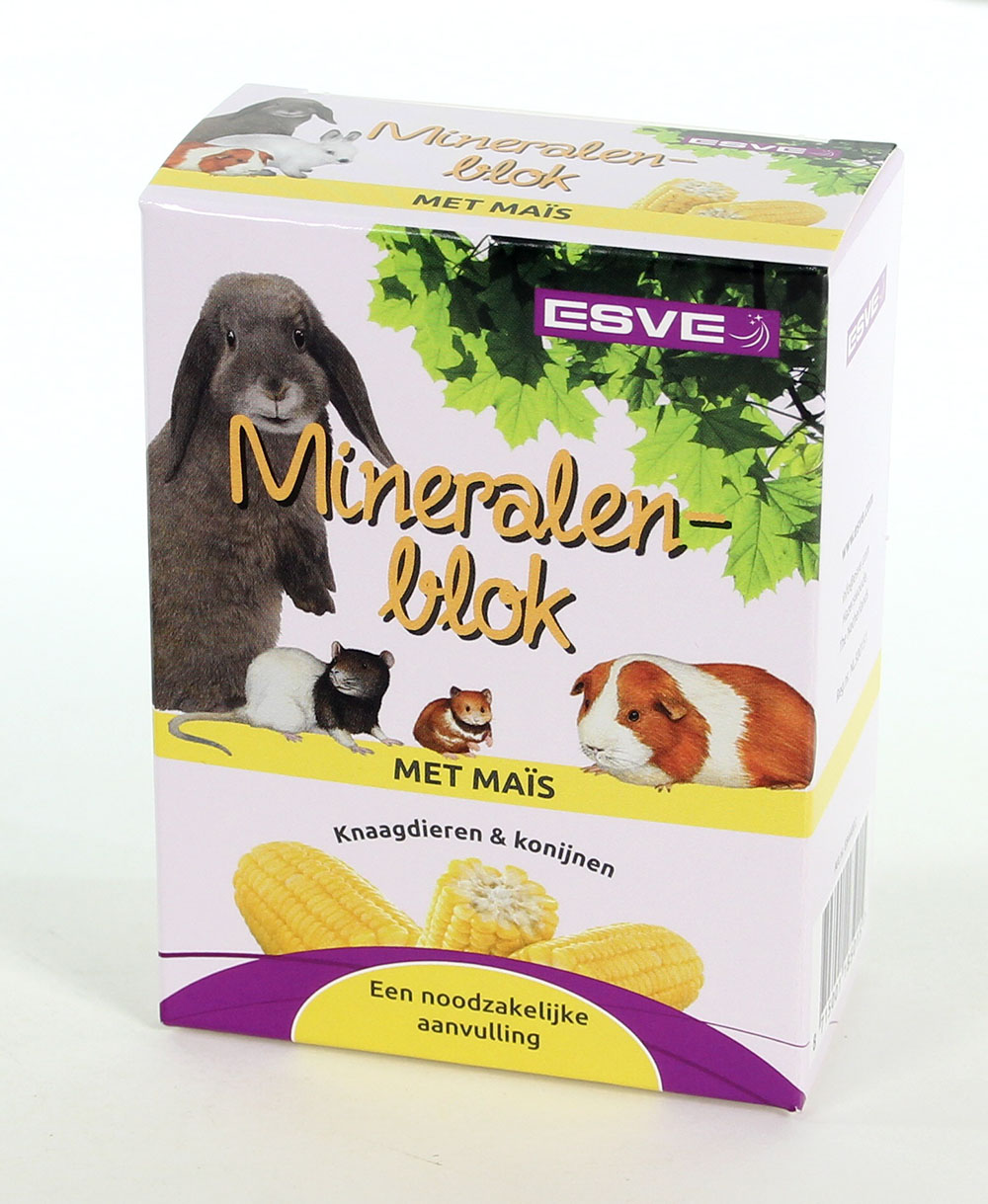 ESVE mineralenblok maïs is een aanvullend mineraalvoeder, speciaal voor konijnen en knaagdieren. Deze zuiver natuurlijke lekkernij draagt bij tot een sterk bottengestel, een mooi gezonde vacht en bevredigt de natuurlijke knaagbehoefte. Om konijnen en knaagdieren gezond te houden mag ESVE Mineralenblok met maïs dan ook niet ontbreken.