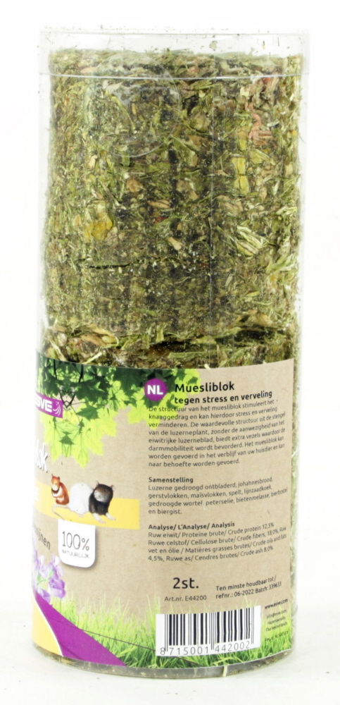 De structuur van het muesliblok stimuleert het knaaggedrag en kan hierdoor stress en verveling verminderen. De waardevolle structuur uit de stengel van de luzerneplant, zonder de aanwezigheid van het eiwitrijke luzerneblad, biedt extra vezels waardoor de darmmobiliteit wordt bevorderd. Het muesliblok kan worden gevoerd in het verblijf van uw huisdier en kan naar behoefte worden gevoerd.