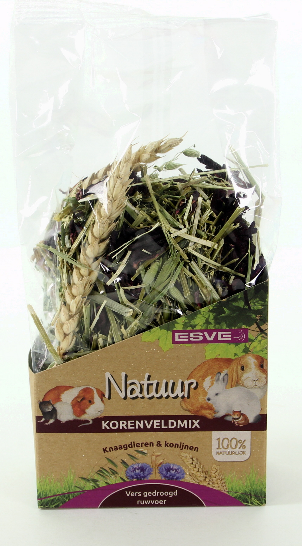 ESVE Natuur Korenveld-mix komt direct van het land en bevat een hoog percentage natuurlijke vezels. Dit zorgt voor een goede spijsvertering bij knaagdieren en konijnen. Hoe beter de spijsvertering, des te meer dit de gezondheid van uw huisdier bevordert. Aanvullend diervoeder voor hobby konijnen en knaagdieren.
